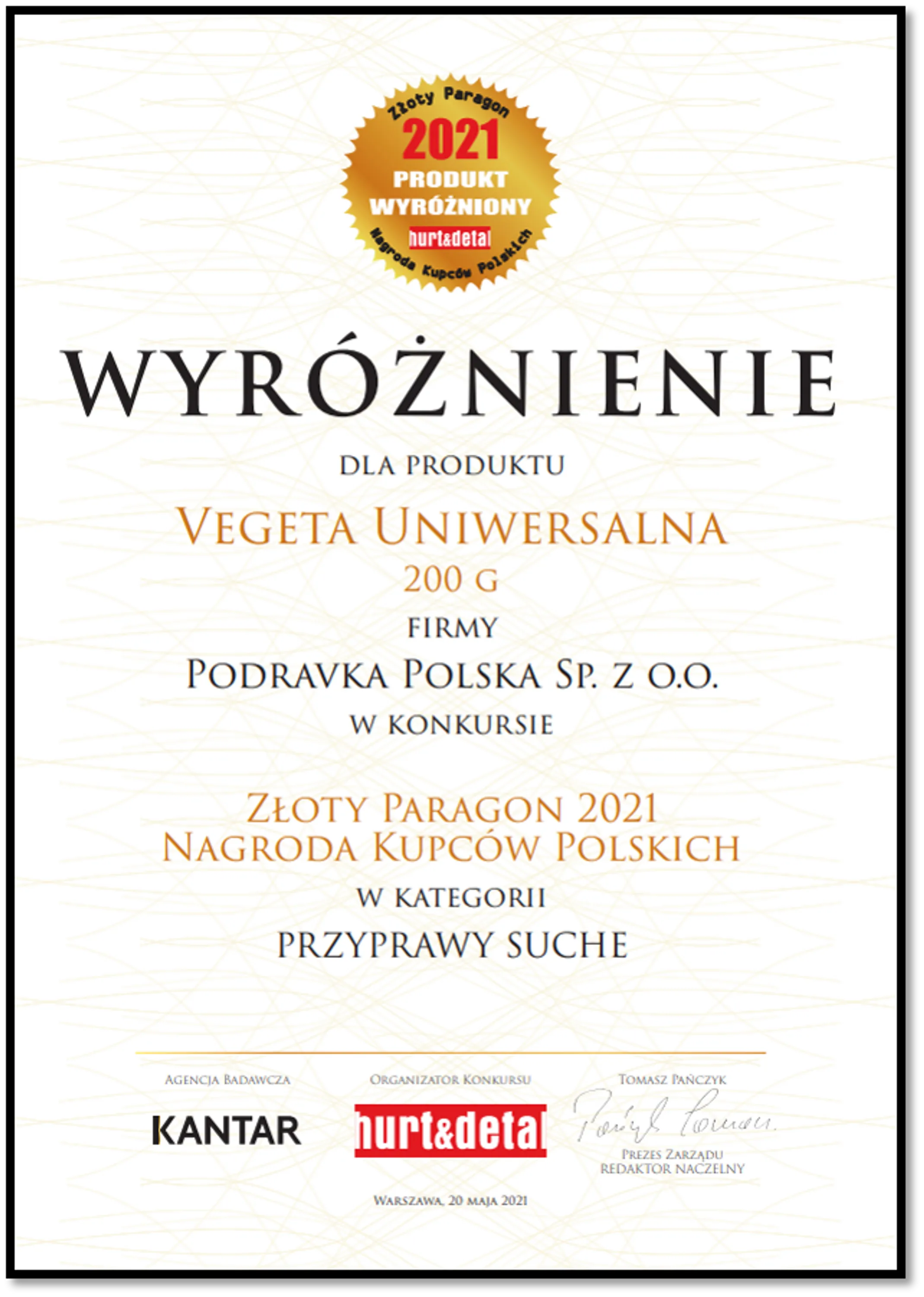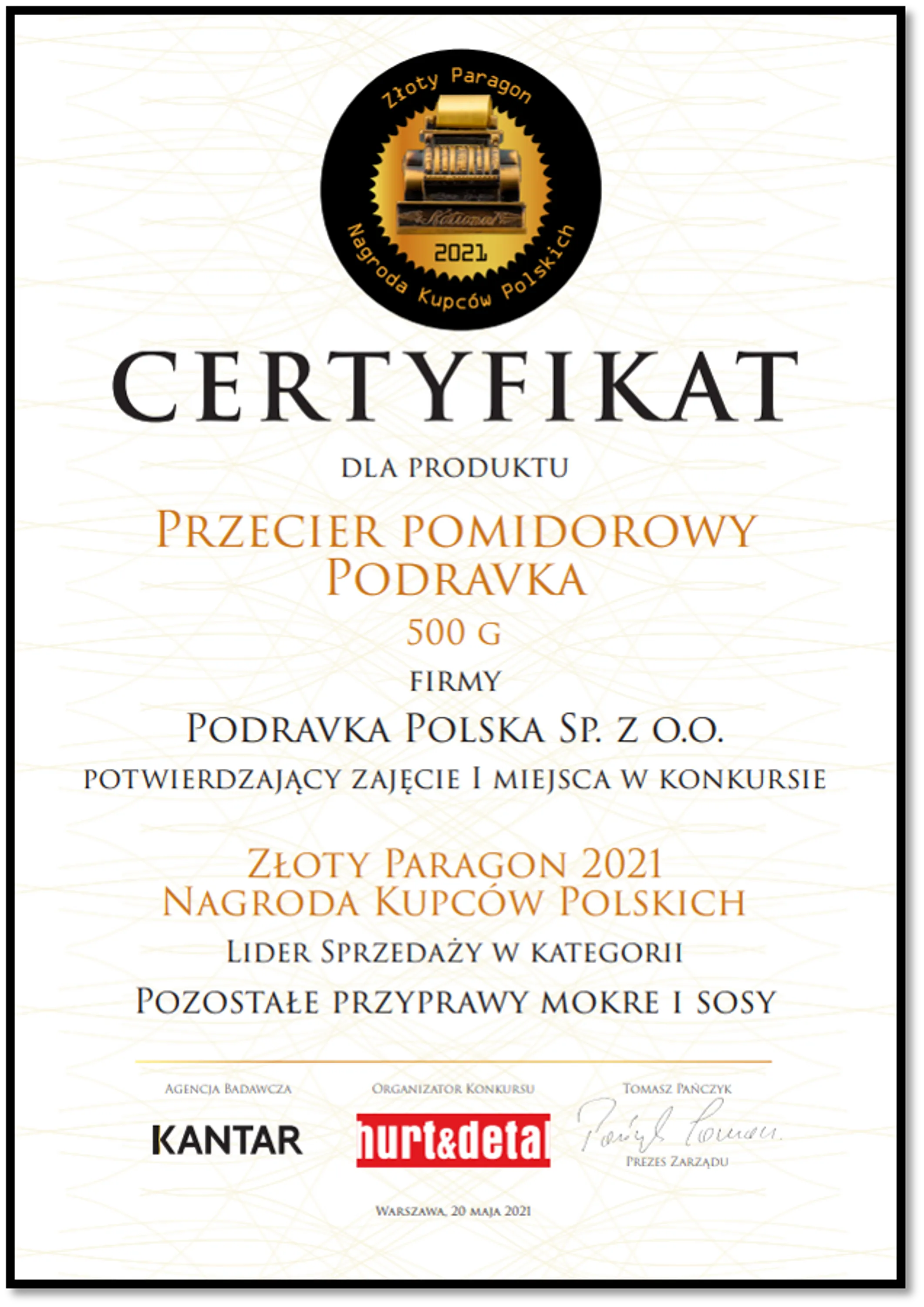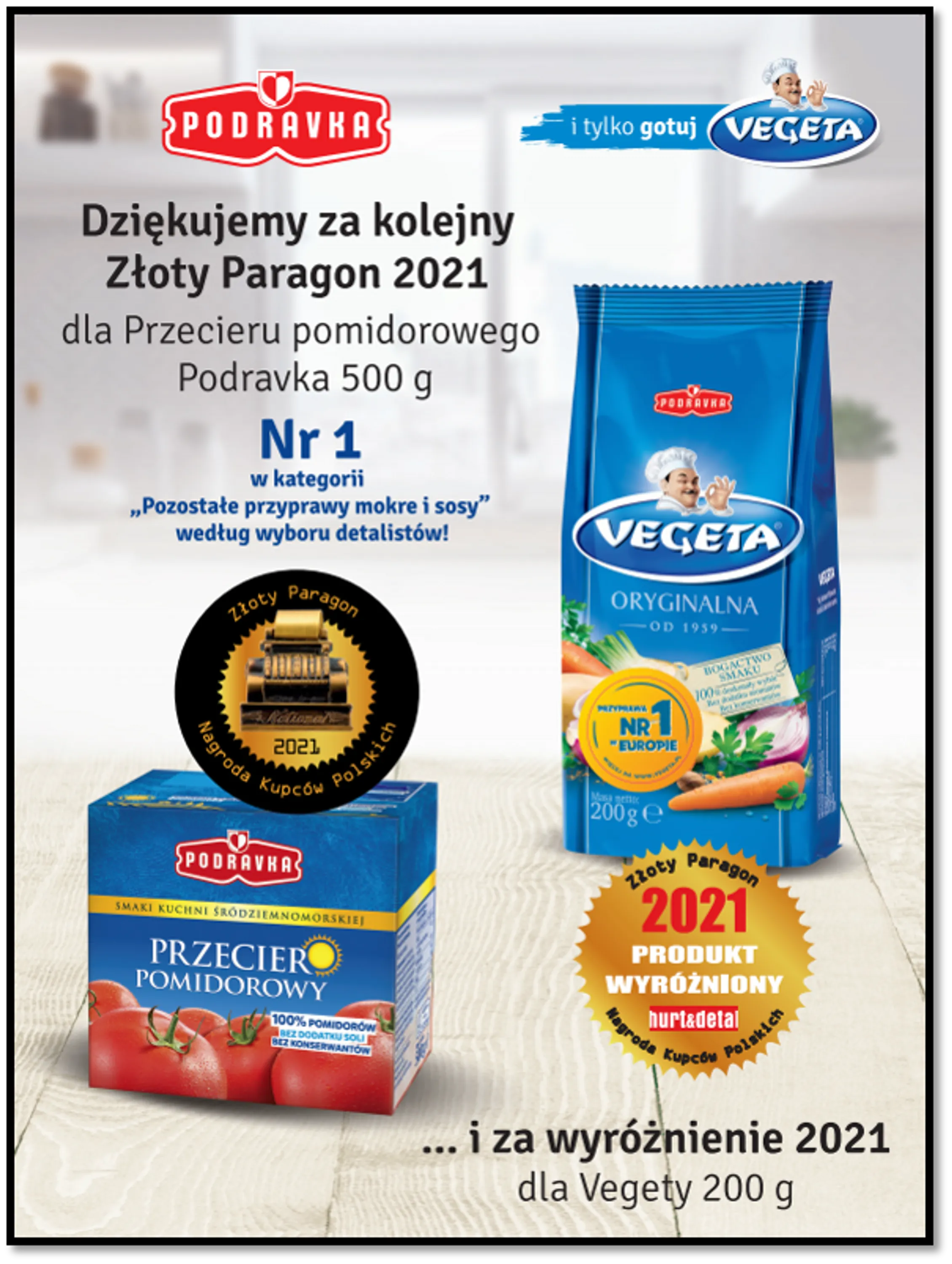 W tegorocznym konkursie „Złoty Paragon – Nagroda Kupców Polskich 2021”, główną nagrodę w kategorii „Pozostałe przyprawy mokre i sosy” otrzymał Przecier pomidorowy Podravka. To dla nas ogromna satysfakcja! Tym bardziej, że nasz produkt zdobył prestiżową statuetkę już po raz czwarty! Ta nagroda to najlepszy dowód uznania dla najwyższej jakości naszego produktu, który doceniają detaliści oraz konsumenci. Dziękujemy za zaufanie!